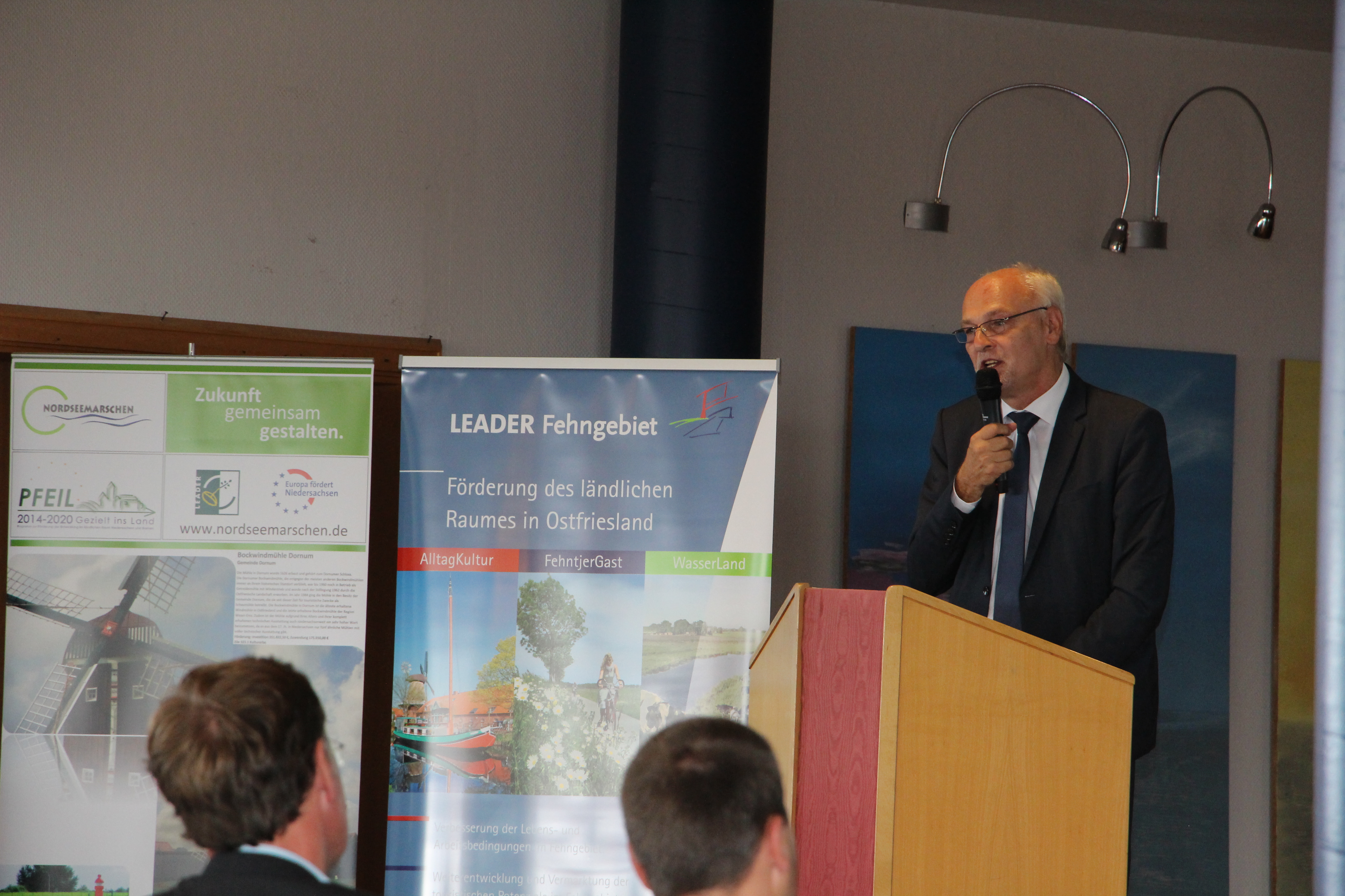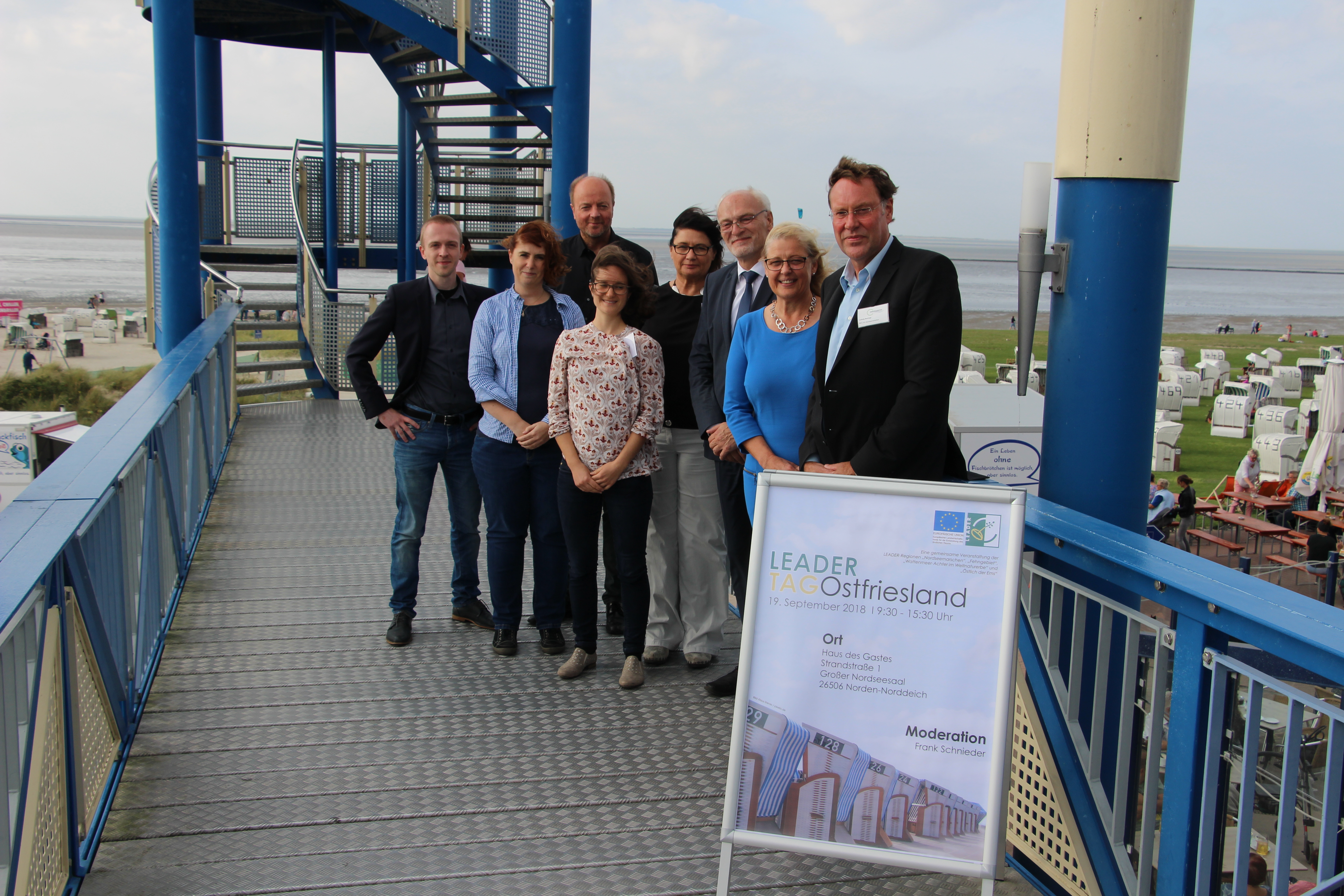Voraussetzung für eine EU-Förderung aus dem LEADER-Programm sind Initiativen aus den Kommunen und Regionen. An der Basis kümmern sich die lokalen Aktionsgruppen (LAG) der europäischen Leader-Regionen um Projekte und Anträge. Am „LEADER“- Tag Ostfriesland kamen dazu LAG’s der europäischen LEADER-Regionen Nordseemarschen, Östlich der Ems, Wattenmeer-Achter und Fehngebiet im Haus des Gastes in Norden-Norddeich zum „LEADER“-Tag Ostfriesland zusammen. Bei dem Treffen in Norddeich ging es zudem darum, künftige Kernthemen des Zusammenlebens im ländlichen Raum als Grundlage für kommende Projekte zu definieren. Unter dem Motto: „Zukunftsorientiert, engagiert, regional – und vorn mit dabei: LEADER in Ostfriesland“ wurden auf der Grundlage interessanter Vorträge u.a. zu den Themen aktive Nachbarschaft, ländliche Nahversorgung sowie Potenziale und Herausforderungen des Ehrenamtes mögliche Perspektiven für das Zusammenleben in der Region diskutiert.