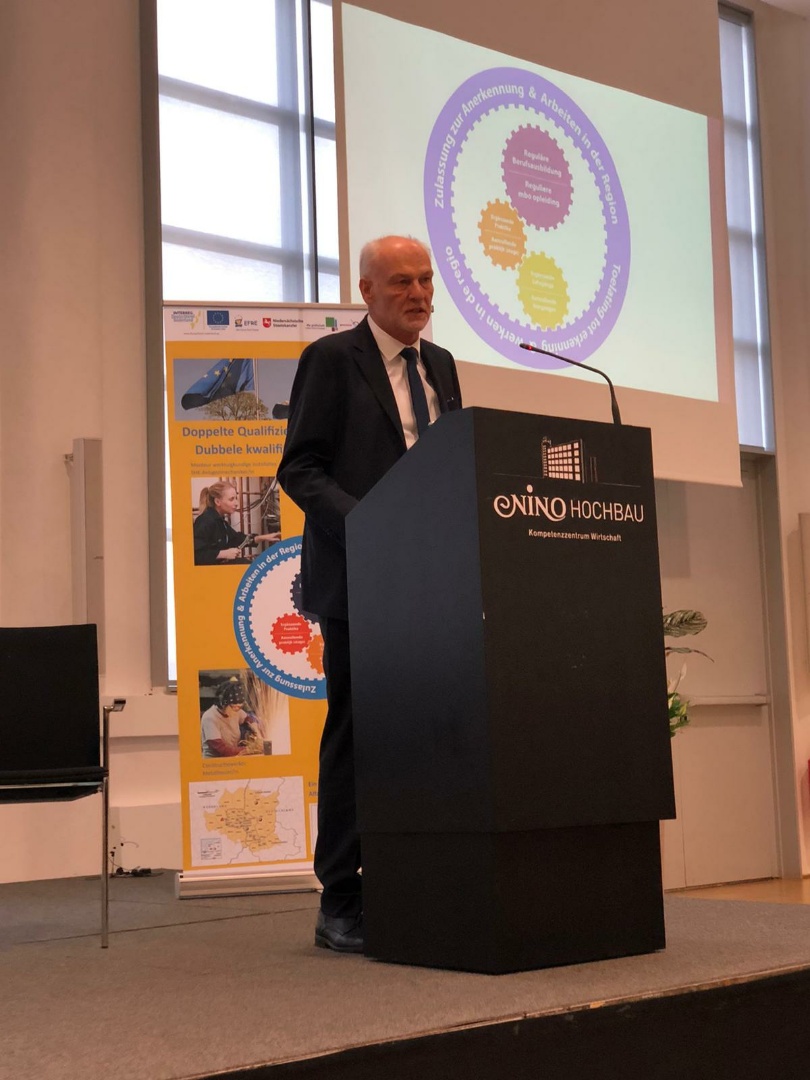 Landesbeauftragter Franz-Josef Sickelmann verwies in seinem Redebeitrag auf die große Unterstützung durch die Europäische Union im Rahmen des Interreg-Programms Deutschland-Nederland, machte aber auch deutlich, dass es weiterhin Probleme im Bereich des grenzübergreifenden Arbeitsmarktes gebe. In vielen Lebensbereichen seien tatsächlich und erkennbar die Grenzen weggefallen. Beim gemeinsamen Arbeitsmarkt seien aber einige Schwierigkeiten geblieben. So gebe es Barrieren der Sprache, der Anerkennung unterschiedlicher Ausbildung, des Steuerrechtes und des Sozialversicherungsrechtes. Sickelmann begrüßte daher die Bemühungen im deutsch-niederländischen Grenzgebiet, die wichtigen Fragestellungen in großen gemeinsamen Projekten zum Thema Arbeitsmarkt koordiniert anzugehen. „Im Ergebnis haben wir erlebt, dass viele Fragestellungen pragmatisch vor Ort gelöst werden können“, sagte Sickelmann, „wir haben auch erlebt, dass sich Schwierigkeiten aus unterschiedlichen nationalstaatlichen Rechtsvorgaben ergeben, die regional nicht gelöst werden können.“