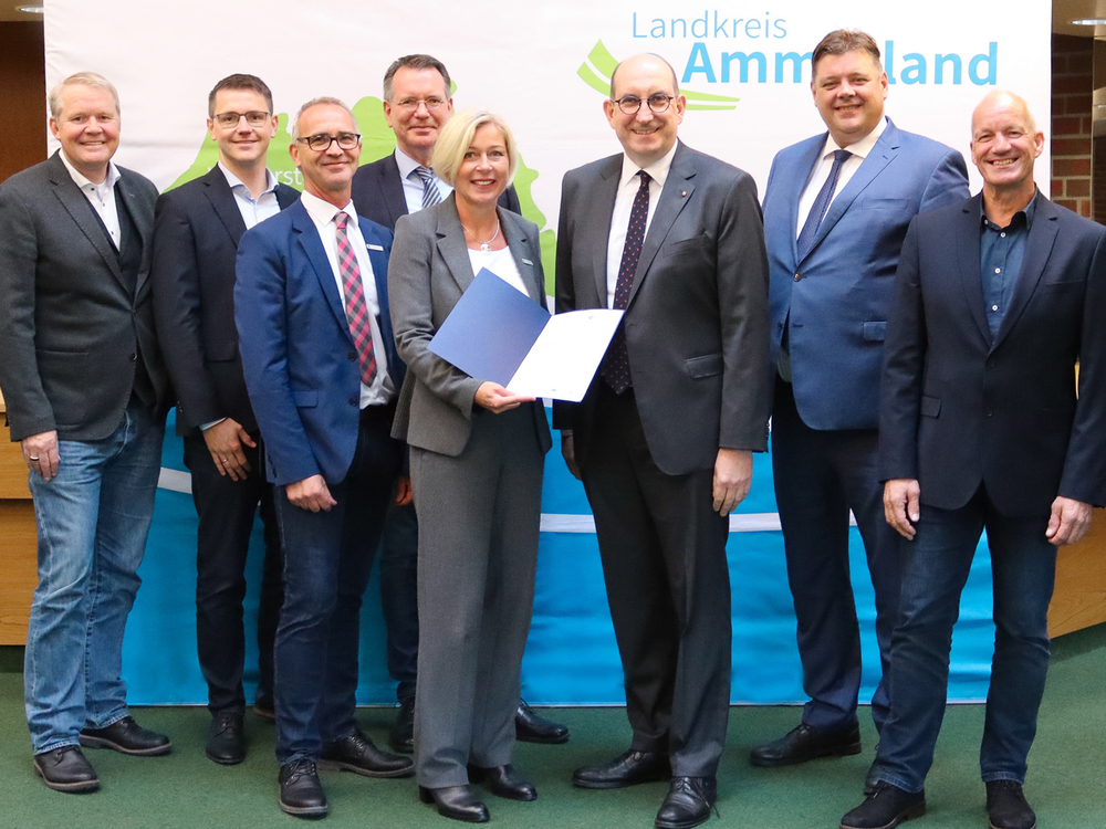 Die Zukunftsregion „Zukunftsregion4Klima“ ist auf dem Weg. Es freuten sich über die Bescheidübergabe (v.l.n.r.): Nikolaus Jansen (ArL Weser-Ems), Hendrik Lehners (Landkreis Ammerland), Thomas Kappelmann (Landkreis Ammerland). Dr. Thomas Jürgens (Landkreis Ammerland), Landrätin Karin Harms (Landkreis Ammerland), Staatssekretär Matthias Wunderling-Weilbier, MdL Jens Nacke, Fred Carstens (Landkreis Ammerland).