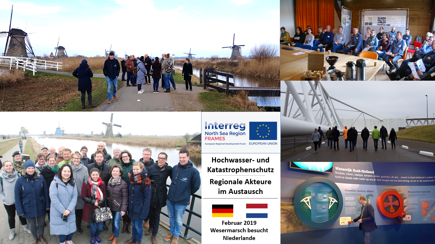 Vom 20. bis 22. Februar 2019 besuchte eine Delegation zwei niederländische FRAMES-Pilotregionen in der Provinz Zeeland (Middelburg) und Südholland (Alblasserwaard, Kinderdijk), um vor Ort in einem intensiven Austausch über Gemeinsamkeiten und Unterschiede in der Herangehensweise im Küsten- und Hochwasserschutz sowie im Katastrophenschutz zu treten. Die Rückfahrt führte durch die Maeslantkering, zum beeindruckenden, gigantischen Sperrwerk des Hafens Rotterdam. Für alle Teilnehmer war es eine bereichernde Exkursion mit intensivem Austausch - über die eigentlichen Projektpartner hinaus, zusammen mit den regionalen Akteuren. Die anfängliche sprachliche Barriere wurde leicht überwunden und war kein Hindernis.