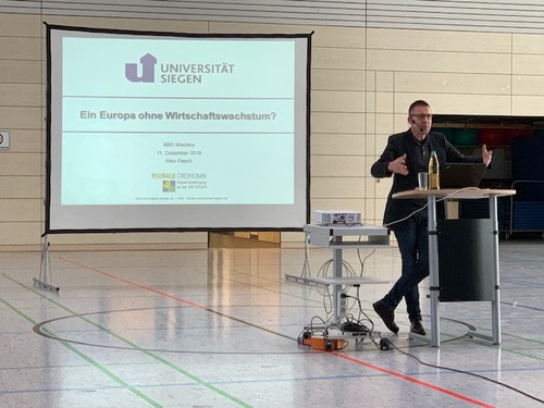 Zu einem Vortrag von Prof. Niko Paech von der Universität Siegen über "Ein Europa ohne Wirtschaftswachstum" lud die BBS Wechloy in Oldenburg in Kooperation mit dem Europabüro des Amtes für regionale Landesentwicklung Weser-Ems am 11.12.2018 ein.