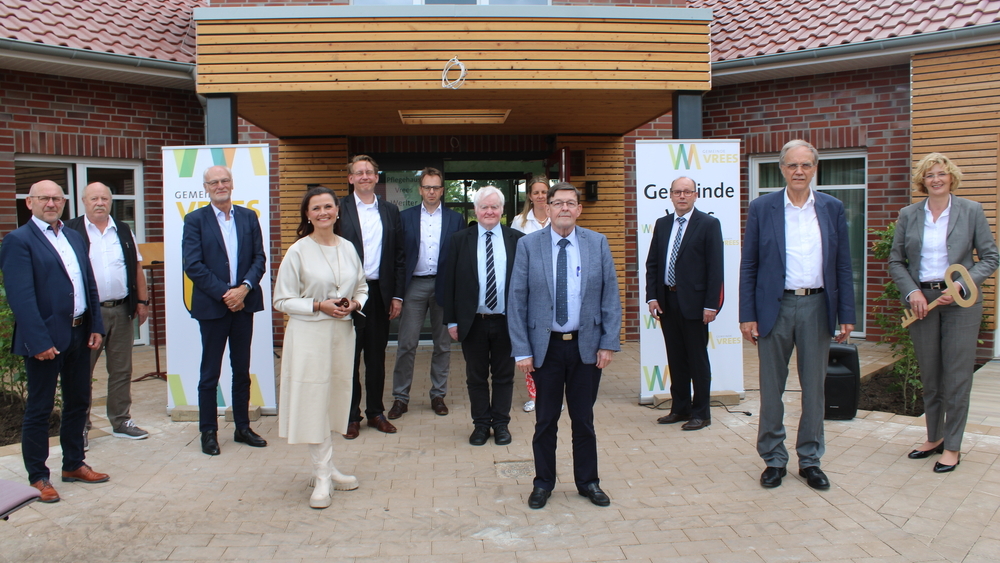 Schlüsselübergabe vor dem Pflegehaus Vrees (v. l. n .r.): Dezernatsleiter Norbert Wencker (ArL Weser-Ems), Alfons Schrandt (Bauausschussvorsitzender Gemeinde Vrees), Landesbeauftragter für regionale Landesentwicklung Weser-Ems Franz-Josef Sickelmann, Gitta Connemann, MdB, Landrat Marc-Andre Burgdorf (Landkreis Emsland), Ludger Kewe (Samtgemeindebürgermeister SG Werlte) Clemens Schwenen (kath. Pfarrer), Andrea Niedenhof (Architektin), Heinz Peters (Vorsitzender des Vereins "Wir für Euch - Altwerden in Vrees"), Antonius Otten (Vorsitzender Caritasrat), Bürgermeister Heribert Kleene (Gemeinde Vrees), Dr. Beate Schulte (Leiterin Caritas-Pflegedienst Hümmling).