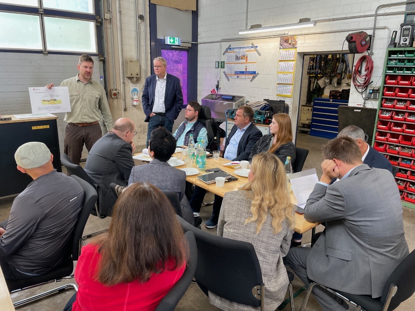 Begrüßt wurden die Besucher und Besucherinnen durch den Landesbeauftragten für regionale Landesentwicklung Weser-Ems Nikolaus Jansen sowie den Leiter der staatlichen Moorverwaltung Michael Diekamp. Beide informierten die Gäste zunächst in der Werkstatthalle der Außenstelle der Moorverwaltung in Meppen (Versen) über die Moorstruktur in Niedersachsen und Weser-Ems sowie über Aufgaben, Organisation und Historie der staatlichen Moorverwaltung. Inmitten der eindrücklichen „Werkstatt-Atmosphäre“ konnte die Besuchsgruppe einen direkten Einblick in den Bewirtschaftungsbetrieb der staatlichen Moorverwaltung mitsamt seinen Spezialtechnikgeräten gewinnen.