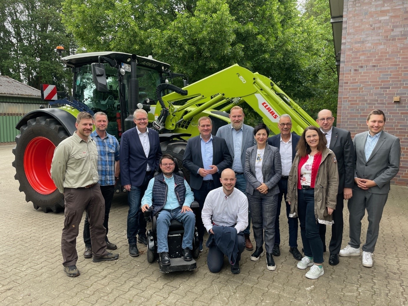 Vor einem neu angeschafften Traktor der Staatlichen Moorverwaltung -- v.l.n.r.: Michael Diekamp (Leiter Staatliche Moorverwaltung, ArL Weser-Ems), Rainer Riesenbeck (Staatliche Moorverwaltung, ArL Weser-Ems), Nikolaus Jansen (Landesbeauftragter für regionale Landesentwicklung Weser-Ems), Constantin Grosch, MdL (Mitglied SPD-Landtagsfraktion und Arbeitskreis „Bundes- und Europaangelegenheiten und Regionale Entwicklung“), Guido Pott, MdL (Mitglied SPD-Landtagsfraktion und Arbeitskreis „Bundes- und Europaangelegenheiten und Regionale Entwicklung“), Christoph Willeke, MdL (Mitglied SPD-Landtagsfraktion und Arbeitskreis „Umwelt, Energie und Klimaschutz“), UIf Prange, MdL (Mitglied SPD-Landtagsfraktion), Immacolata Glosemeyer, MdL Mitglied SPD-Landtagsfraktion und Sprecherin Arbeitskreis „Bundes- und Europaangelegenheiten und Regionale Entwicklung“), Gerd Hujahn, MdL (Mitglied SPD-Landtagsfraktion und Arbeitskreis „Umwelt, Energie und Klimaschutz“), Andrea Kötter (Vorsitzende des SPD-Kreisverbandes Emsland), Matthias Wunderling-Weilbier (Staatssekretär im Niedersächsischen Ministerium für Bundes- und Europaangelegenheiten und Regionale Entwicklung), Brian Baatzsch, MdL (Mitglied SPD-Landtagsfraktion und Arbeitskreis „Bundes- und Europaangelegenheiten und Regionale Entwicklung“)