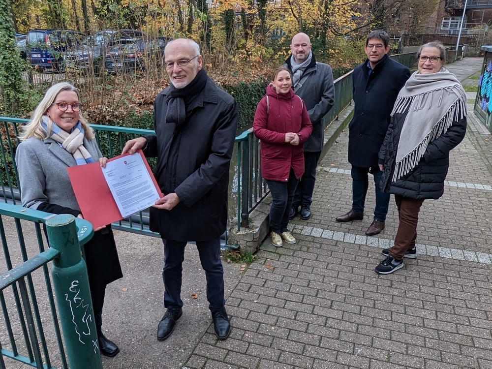 Oberbürgermeisterin Petra Gerlach nimmt den Bescheid vom Landesbeauftragten für regionale Landesentwicklung Weser-Ems, Franz-Josef Sickelmann entgegen. Julika Holz (Fachdienst Stadtplanung), Stefan Lehmann (Fachdienstleiter Stadtplanung), Maximilian Donaubauer (Fachbereichsleiter Planen, Bauen, Umweltschutz, Landwirtschaft und Verkehr) und Stadtbaurätin Bianca Urban freuen sich über die guten Nachrichten (Personen v. l. n. r.).