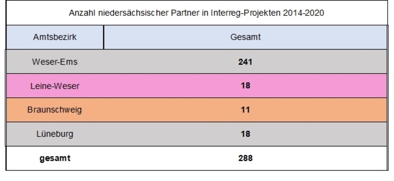 In der Region Weser-Ems flossen in der aktuellen Förderperiode 2014-2020 im Rahmen der Interreg-Förderung Mittel aus dem Europäischen Fonds für regionale Entwicklung (EFRE) in Höhe von 31.280.000,00 € an 241 niedersächsische Projektpartner.