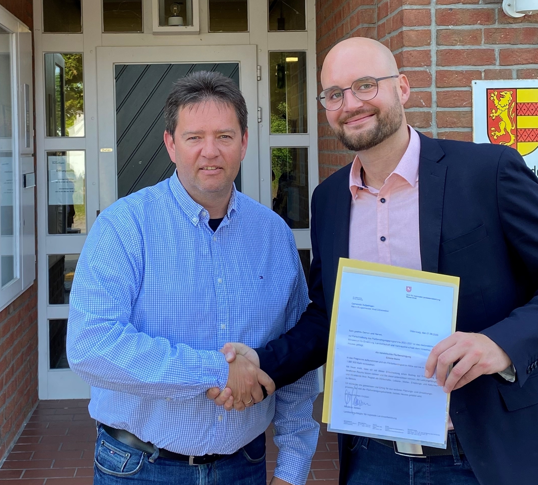Das Amt für regionale Landesentwicklung Weser-Ems hat an diesem Donnerstag, 8. Juni, diese positive Nachricht dem Bürgermeister Herrn Axel Linneweber überbracht. In einem rund 850 ha großen Gebiet um die Ortschaften Sillens und Isens der Gemeinde Butjadingen wurde eine Flurbereinigung vorbereitet. Insgesamt werden für die Flurbereinigung „Sillens-Isens“ finanzielle Mittel in Höhe von 2.650.000 € beim Niedersächsisches Ministerium für Ernährung, Landwirtschaft und Verbraucherschutz bereitgestellt. Diese werden zu 75 Prozent von EU, Bund und Land bezuschusst. Von diesen Mitteln sollen rund 2.000.000 € in den ländlichen Wegebau fließen.