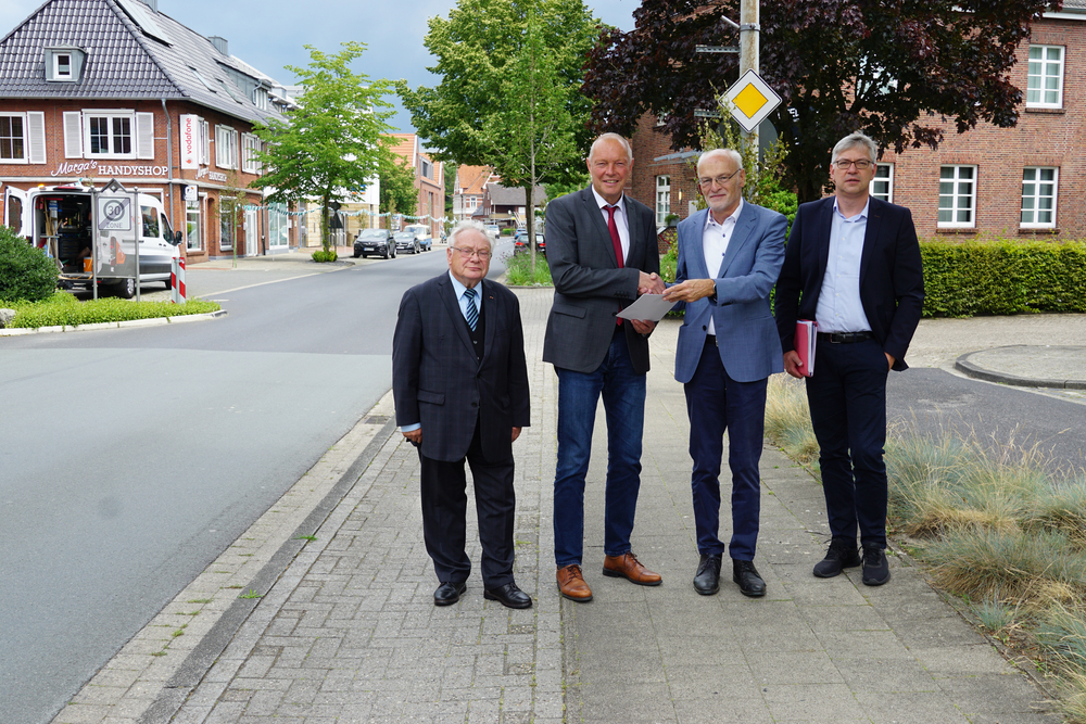 Gute Nachrichten in Form eines Zuwendungsbescheides überbrachte der Landesbeauftragte für regionale Landesentwicklung Weser-Ems, Franz-Josef Sickelmann (2. von rechts). Es freuten sich Samtgemeindebürgermeister Günter Oldekamp (2. von links), Erster Samtgemeinderat Michael Kramer (rechts) und der Bürgermeister der Gemeinde Neuenhaus, Paul Mokry (links).