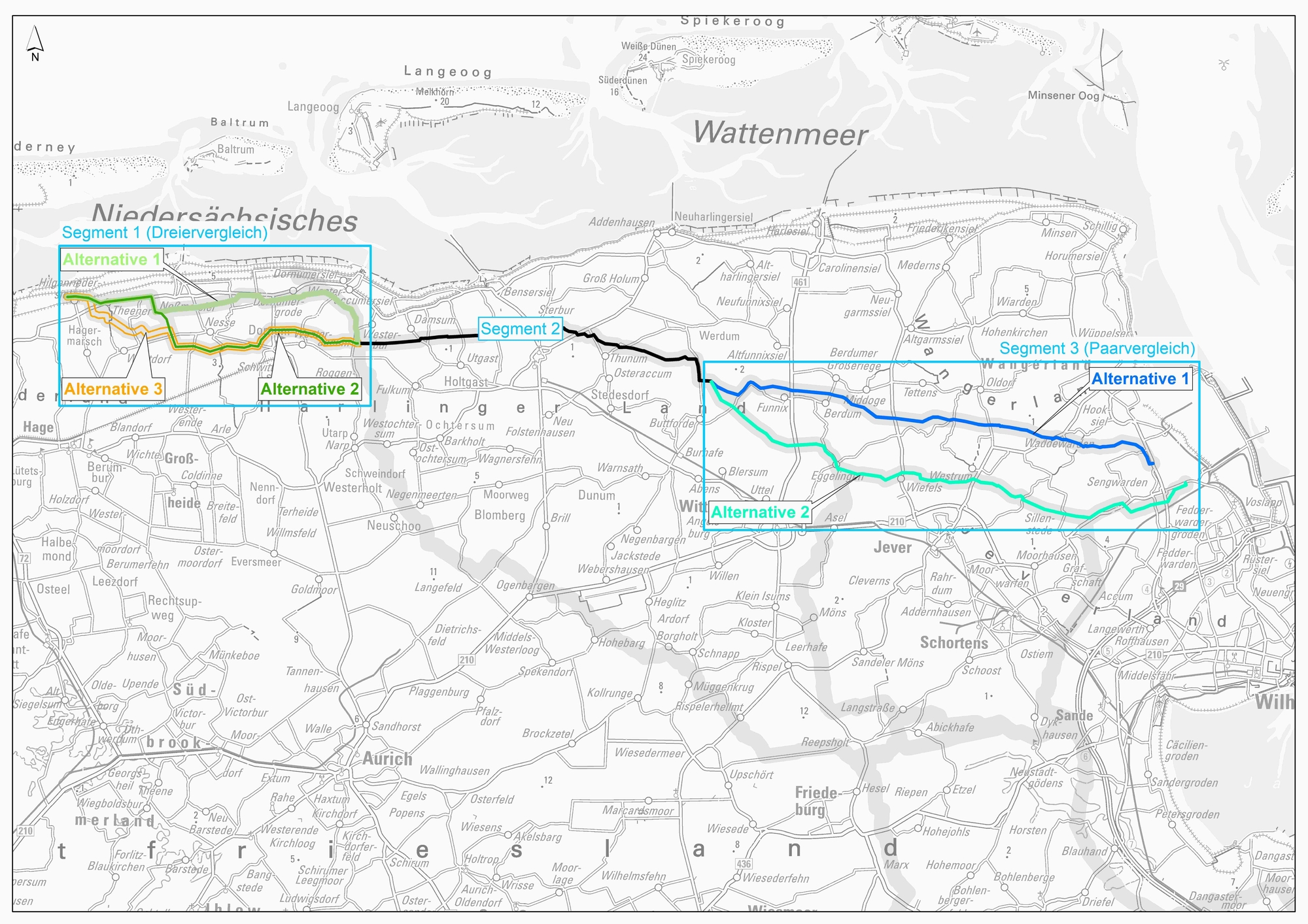 Karte nach Wilhelmshaven: Vorzugsalternative der TenneT Offshore ist Alternative 2 und 3 im Segment 1 sowie Alternative 1 im Segment 3