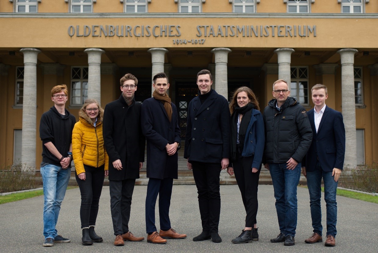 Der Kopf des Organisationsteams vor dem Landesbehördenzentrum Oldenburg (von links): Lennart Münstermann, Amelie Jacobs, Maximilian Kürten, Patrick Marquardt, Jonas Bitter, Tomma Steggewentz, Helge Peter Ippensen vom Europabüro des Amtes für regionale Landesentwicklung Weser-Ems und Karl Grotheer.