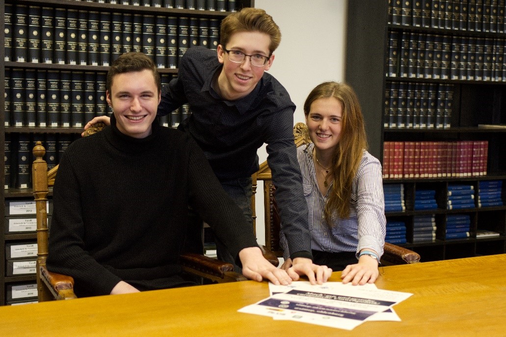 Das Präsidium präsentiert die Plakate zur SimEP 2020 (von links): Jonas Bitter (Stv. Parlamentspräsident), Maximilian Kürten (Kommissionspräsident) und Tomma Steggewentz (Parlamentspräsidentin).