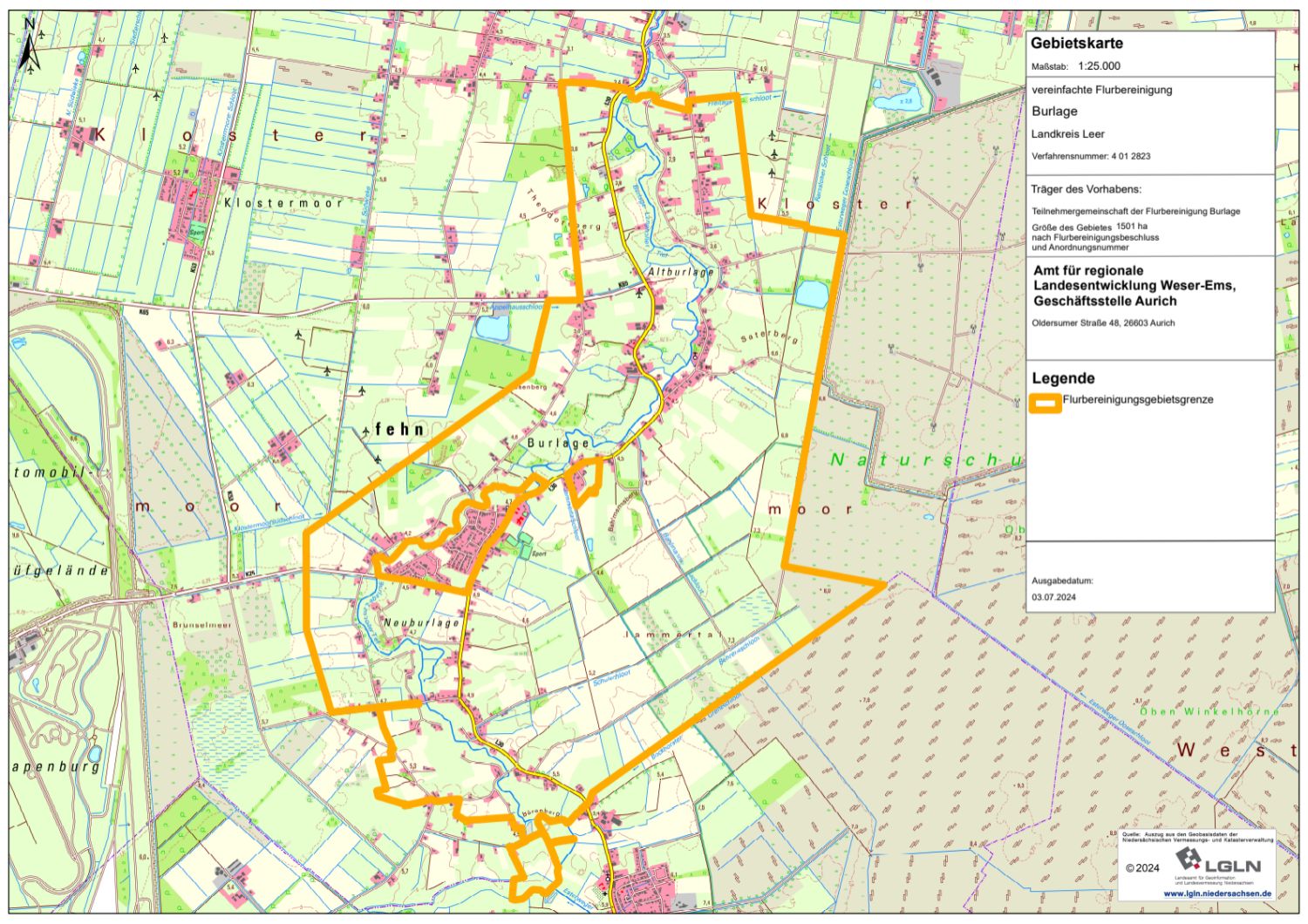 Das Flurbereinigungsgebiet Burlage liegt im Landkreis Leer in der Gemeinde Rhauderfehn.